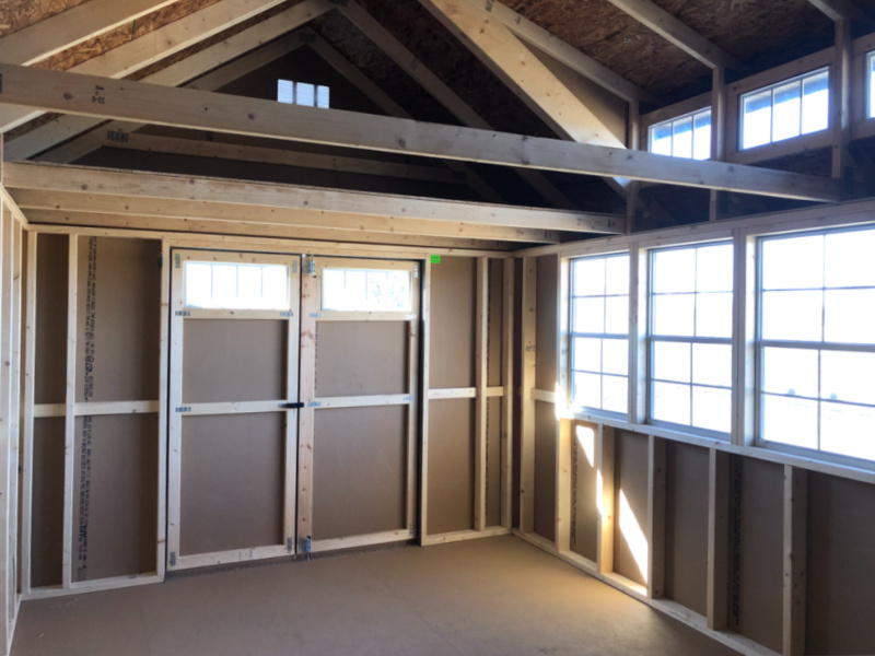 10×16 skyview- deluxe. This barn includes (3) transom windows, stained body, 60 inch double doors, (1) 24×36 window & diamond threshold at entry.
