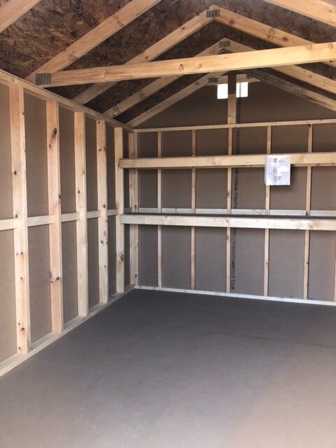 8X12 gable deluxe. This barn includes diamond threshold and (2) 16" shelves.