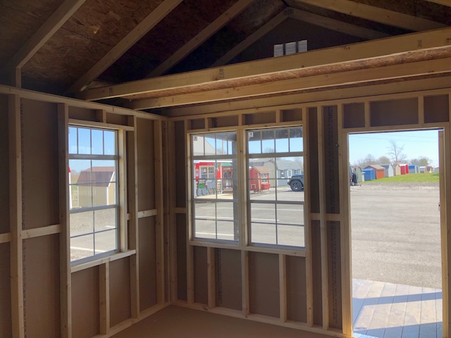 10×14 The Woodsman deluxe, with 6 foot porch. This barn includes (3) doors, transom windows, door magnets & diamond threshold.