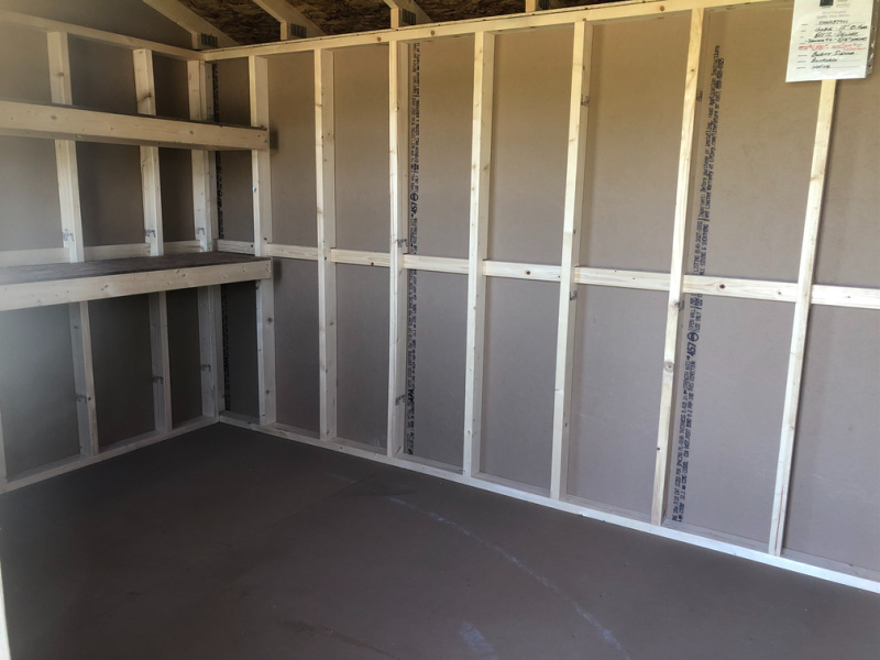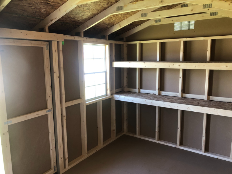 8x12 gable deluxe with 12" overhang. This barn includes dimming threshold at entry & (2) 16" shelves.