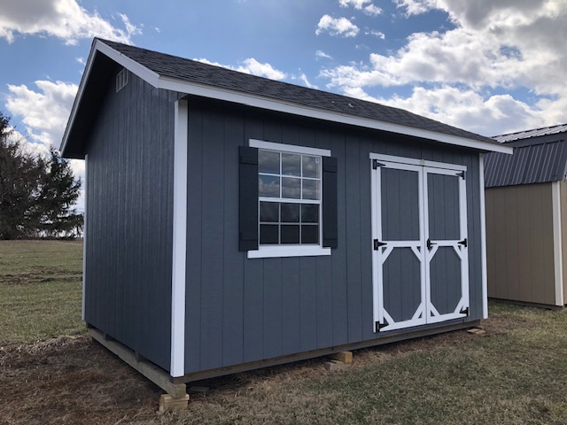 10x14 Gable Elite. This barn includes diamond threshold at entry, 60 " doors, 24" x 36" window, shutters, 30" x 36" window & air vents.