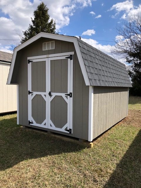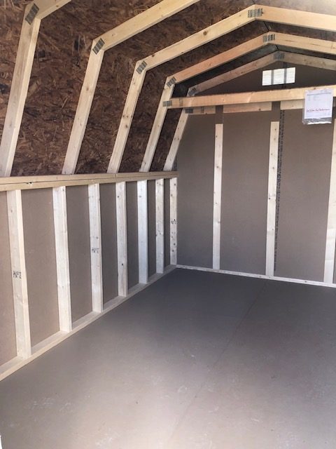 8x12 barnstyle deluxe with 4 foot walls. This barn includes diamond threshold at entry, 52" doors, 2 foot loft & air vents.