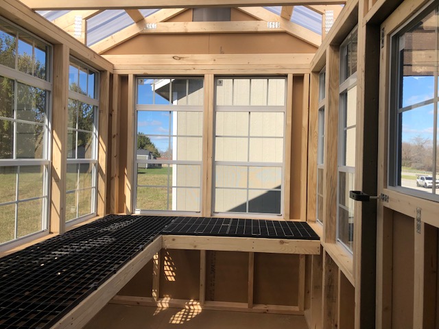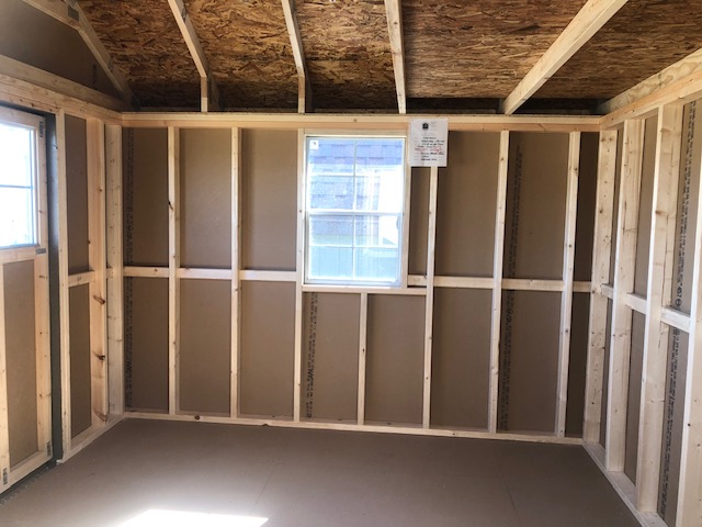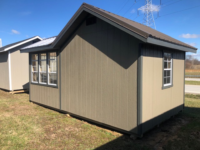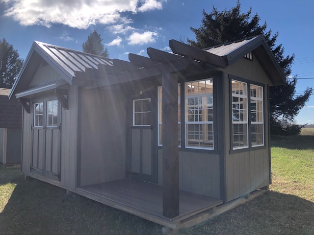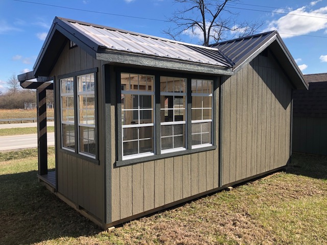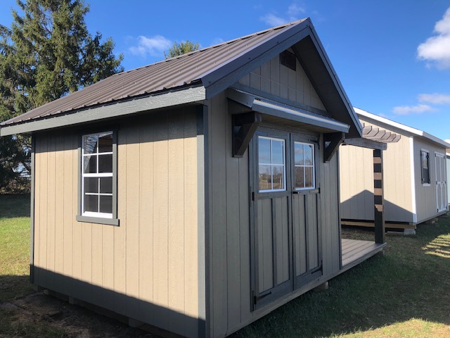 10x18 farmstead deluxe, with side porch. This barn includes diamond threshold at entry & sandbar.